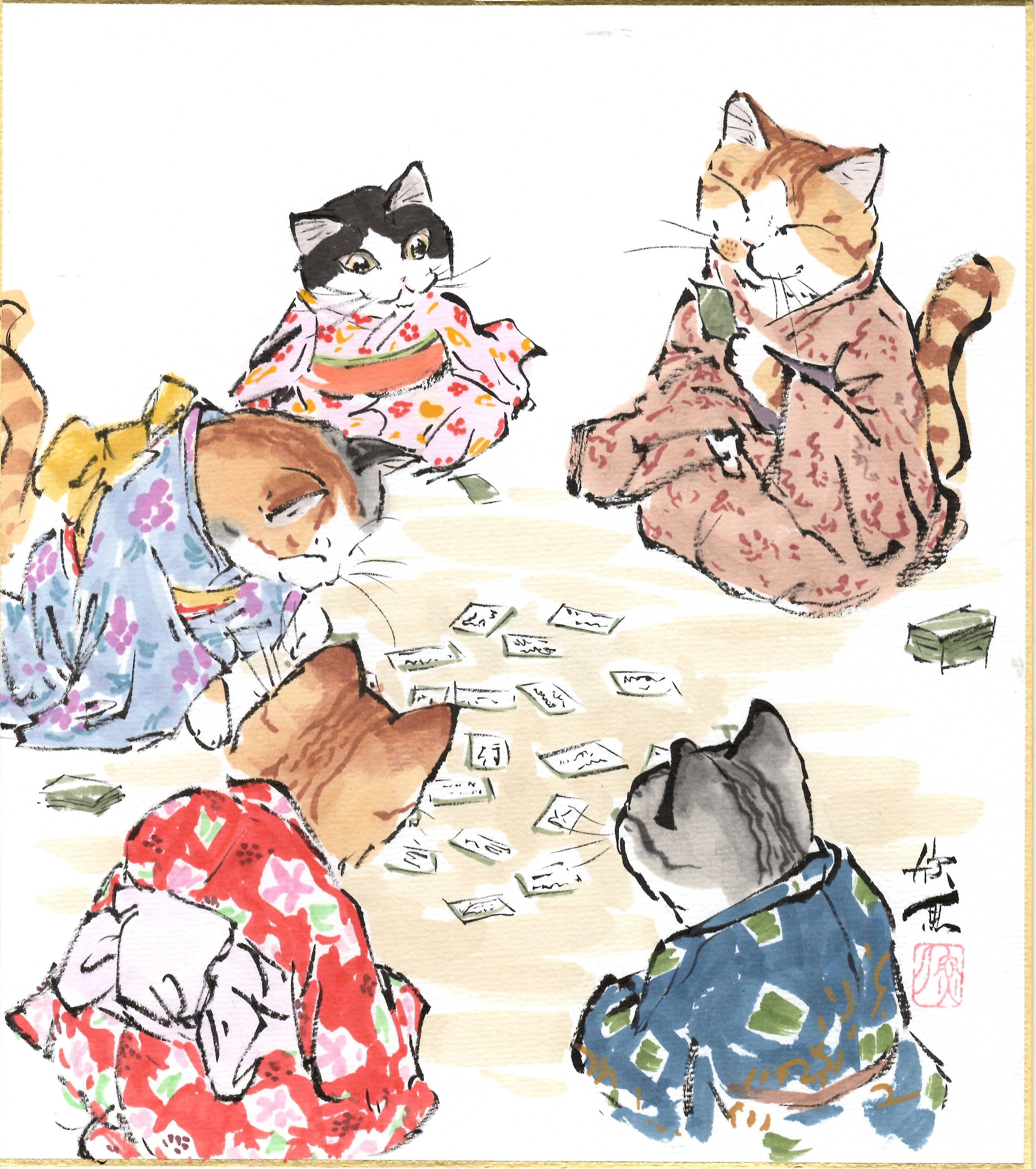 西村欣魚「百人一首猫」色紙絵
