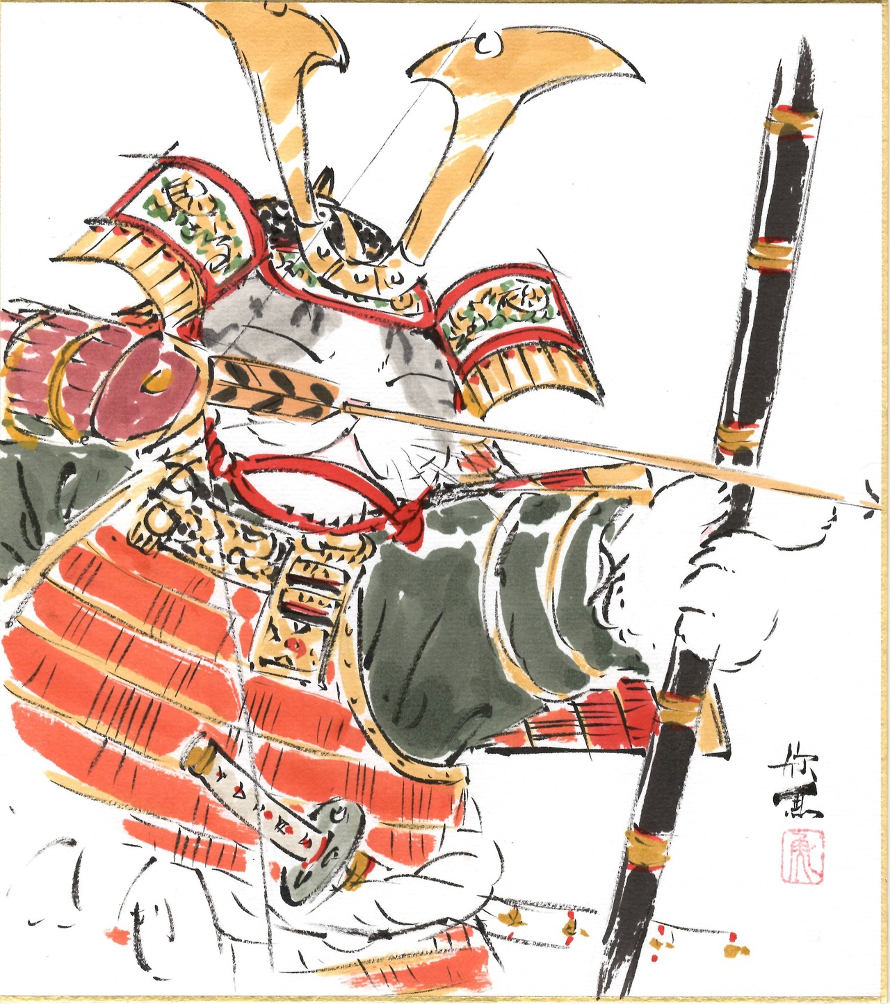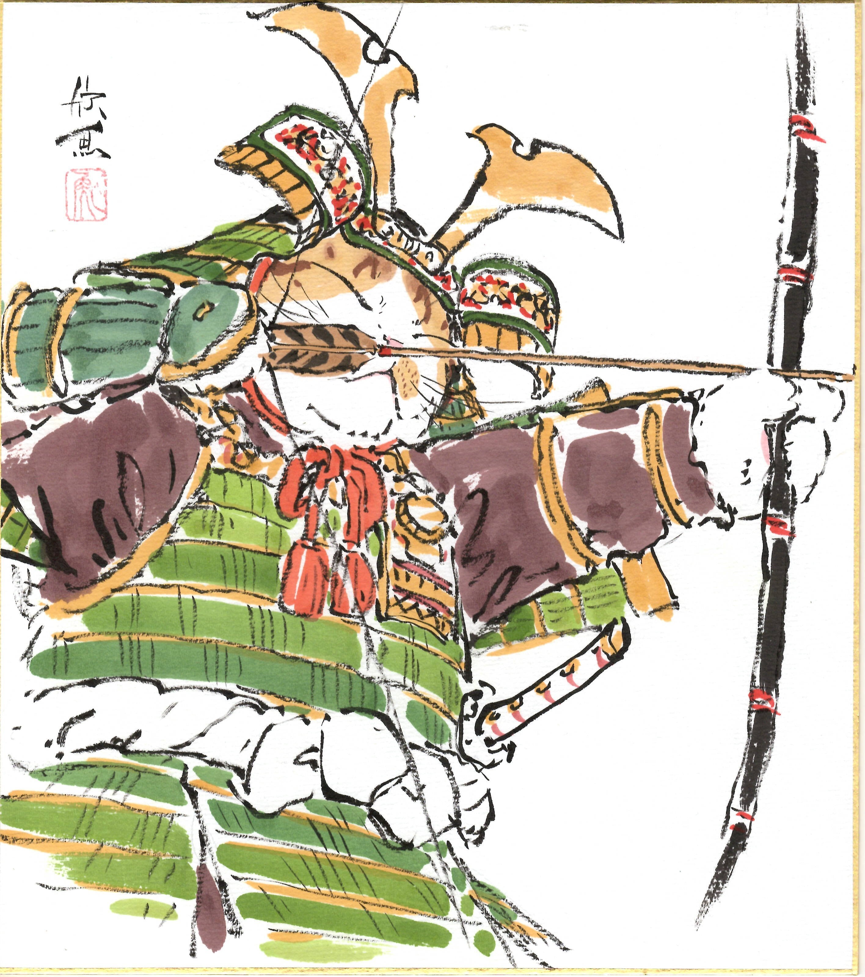 西村欣魚「武者猫」色紙絵