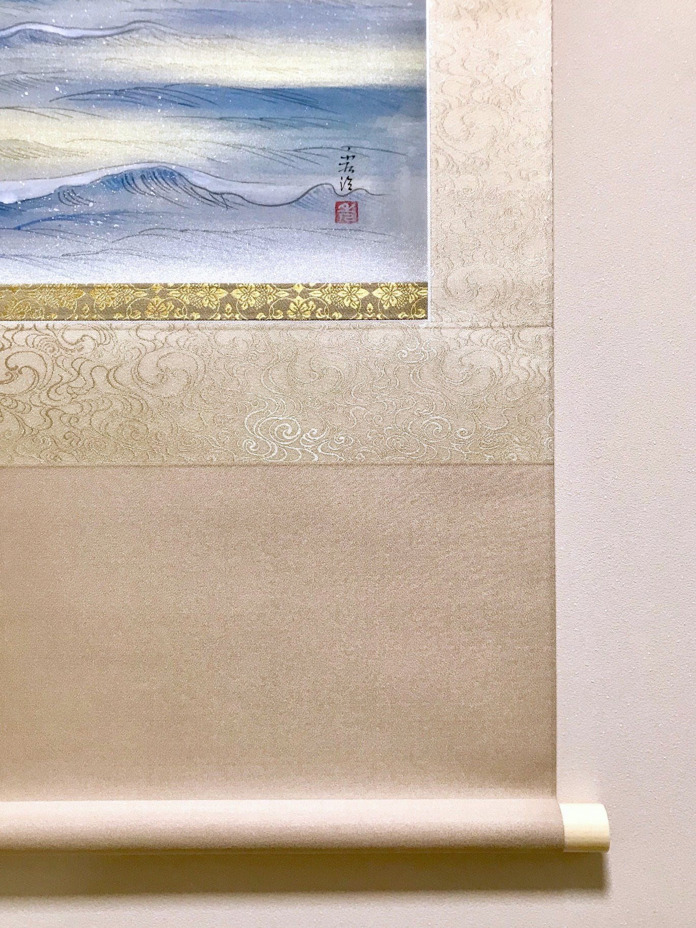 掛軸の裂地には上質な正絹と本金を用い、巻きシワを防ぐための太巻芯棒も付けております。