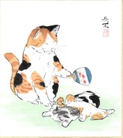西村欣魚「団扇猫」色紙絵