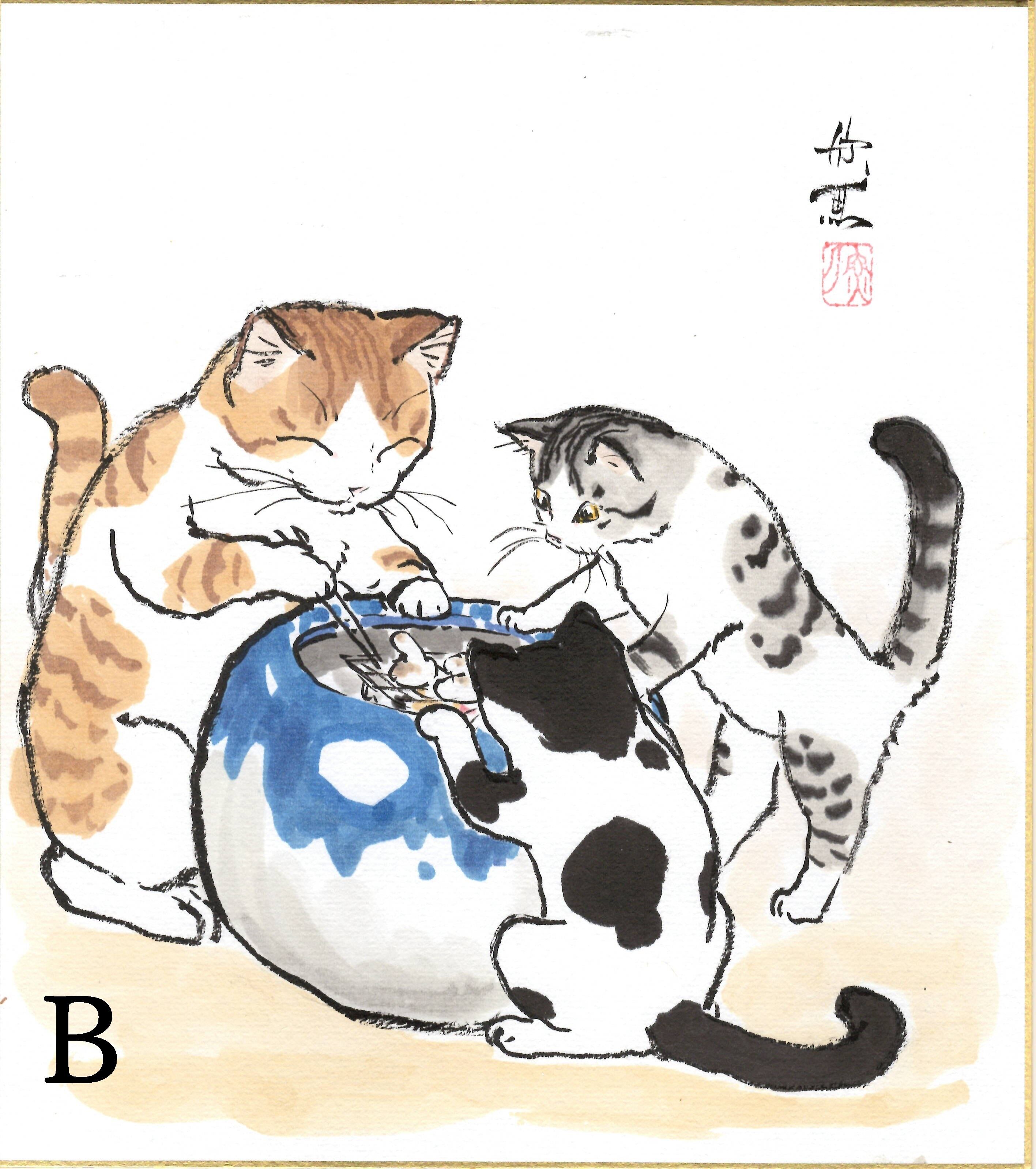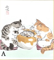 西村欣魚「餅焼き猫」色紙絵