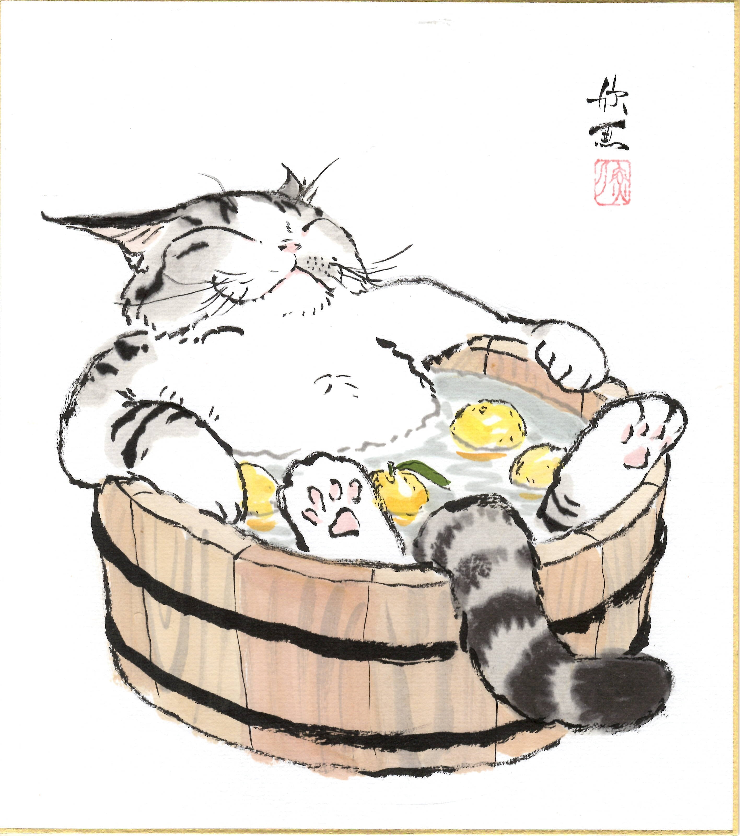 西村欣魚「猫の柚子風呂」色紙絵